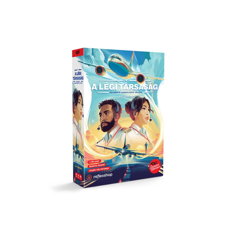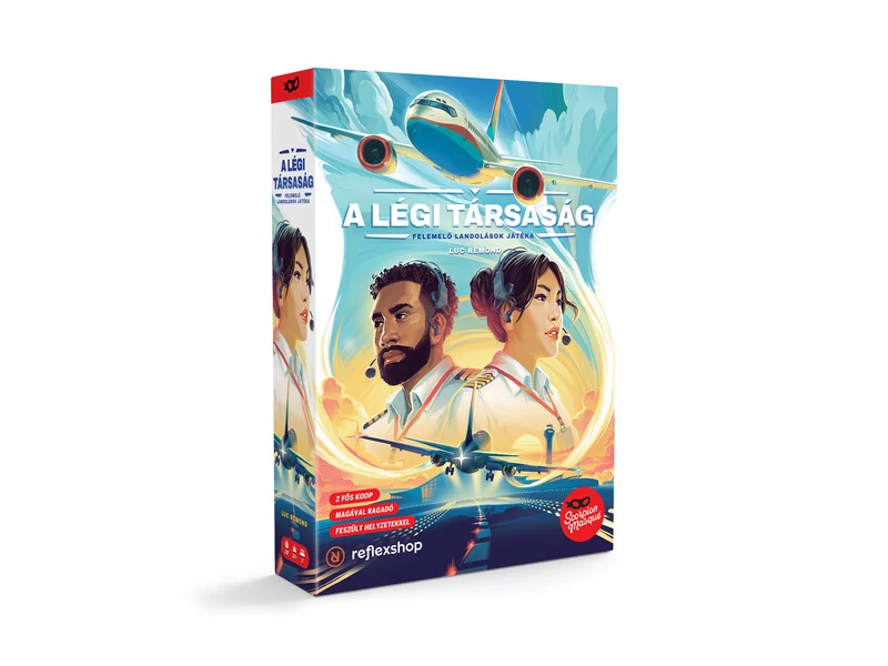 A légi társaságJátékosok száma: 2 játékos, Korosztály: 12 + kortól ajánlott, Játékidő: kb. 20 perc.Felemelő landolások játéka. A Légi társaság társasjátékban irányíthatsz egy utasszállító repülőgépet a megbízható társad közreműködésével, hangolva össze az erőfeszítéseiteket, hogy sikerrel szálljatok le a géppel a világ minden táján. Csupán némi együttműködésre és acélidegekre van szükségetek a sikerhez. Ebben a kooperatív társasjátékban egy csapatként, pilótákat alakítva kell a világ különböző repülőterein landolnotok. De a repülőgéppel leszállni komplexebb feladat, mint elsőre gondolnánk. A forgalomtól mentes megközelítést, a sebesség megfelelő beállítását, a repülőgép vízszintes irányítását is úgy kell menedzselnetek, hogy közben a biztonságos leszállás érdekében ki is kell engednetek a futóművet. A játék 7 fordulóból áll, mindegyik 3 fázisban strukturált. A stratégiai megbeszélés és a kockadobás, a kockalehelyezés és a forduló vége képezik a fordulókat.Az utolsó forduló akkor veszi kezdetét, amikor a kijelzőn a repülőtér jelenik meg, a magasság kijelzőjén pedig a repülőgép látható. Pontos időzítésre van szükség, hogy a leszállás megfelelően történjen. A sikeres földet érés után a fékeket kell használni a megfelelő megállás érdekében. A doboz mérete: 25 cm x 18,5 cm.A társasjáték kihívást jelenthet a repülési tudásotok próbájával Montreáltól egészen Tokióig a világ leghíresebb repterein! Fogjatok össze, mennyire tudtok egymáson segíteni ebben a játékban!A doboz tartalma:Fő játékelemek:1 leszállási eljárás füzet 1 háromrétegű vezérlőpult 1 fordulásjelző-korong 4 kék dobókocka 4 narancssárga dobókocka 2 paraván/játékossegédlet 1 magasságsáv 1 megközelítéssáv (Montreal-YUL) 12 repülőjelölő 2 aerodinamika jelölő (kék és narancssárga) 1 fékjelölő (piros) 3 kávéjelölő 2 újradobás jelölő 10 kapcsoló