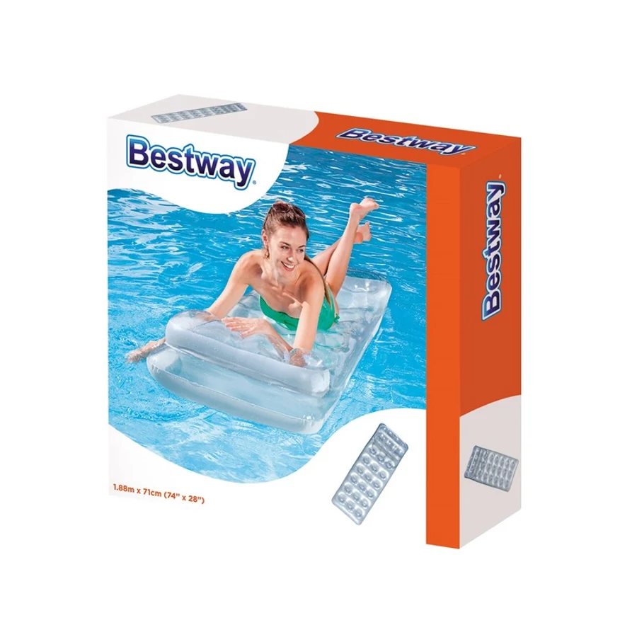 A(z) **Átlátszó matracágy - 188 x 71 cm** – A Poharas matracágy igazi kényelmes pihenést biztosít akár a medence közepén is. A matracot biztonsági szelepen keresztül tudod felfújni, a matrac nagyon erős, előre tesztelt műanyagból készült. Felfújt méretek: 188 x 71 cm. > 6 éves kortól > Bestway