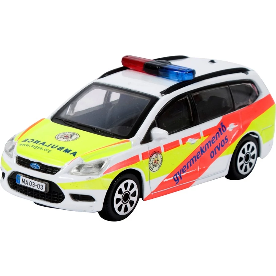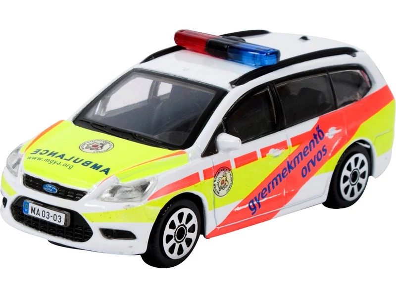 A(z) **Bburago 1/43 Gyermek mentőorvosi autó -156-30279-** – A Magyar Gyermekmentő Alapítvány által használt autók kicsinyített mása. A Bburago gyermek mentőorvosi kocsi egy Ford Focus autó, villogóval és az itthoni mentőorvosi autók festésével. A kisautó fémből és műanyagból készült. Az autó motorháztetején az Ambulance felirat, a Magyar Gyermekmentő Alapítvány logója szerepel, az oldalán a gyermekmentő orvos felirat díszíti. Méretek: 10 x 4 x 4 cm. > 3 éves kortól ajánljuk Márkanév: Bburago