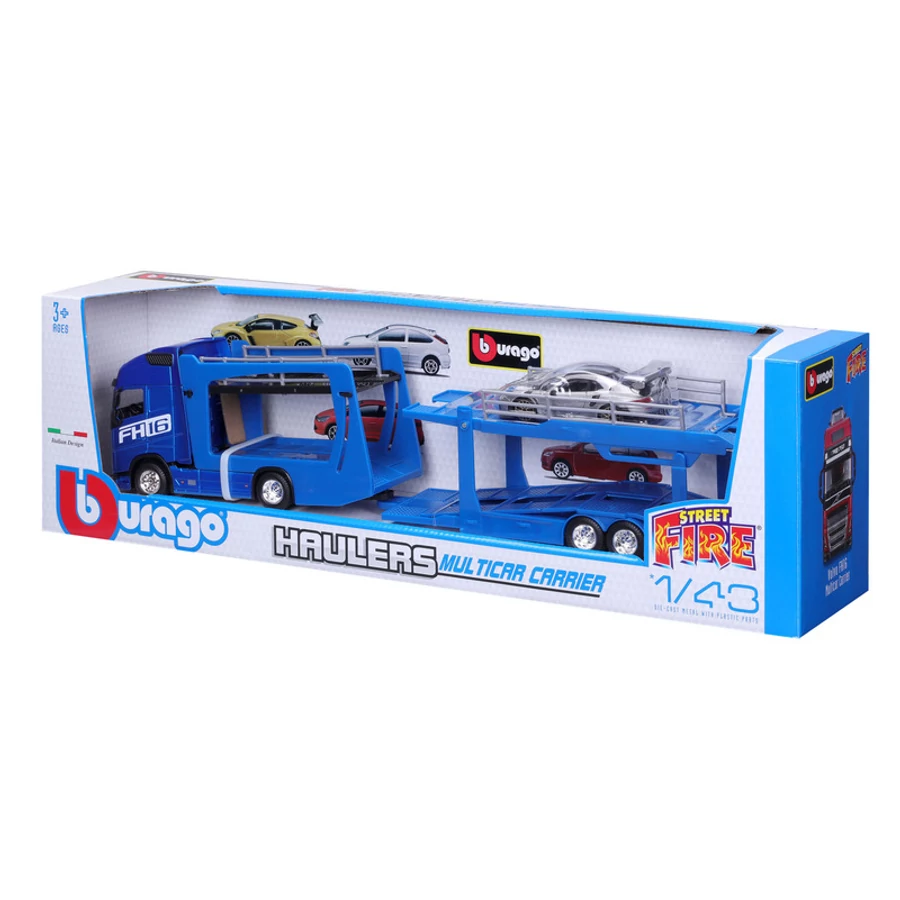 Szállításra készen! A Bburago StreetFire Volvo FH16 autószállító 1:43 méretarányban elegendő helyet kínál több autó szállításához az autógyárból az autókereskedésekbe. A legjobb pedig az, hogy a készletben egy hozzá illő játékautó, egy ezüstszínű Porsche 911 GT2 RS található. Így biztosítva az azonnali szórakozást és izgalmat. A kék autószállító, kb. 46 cm hosszú, 3 éves kortól alkalmas.