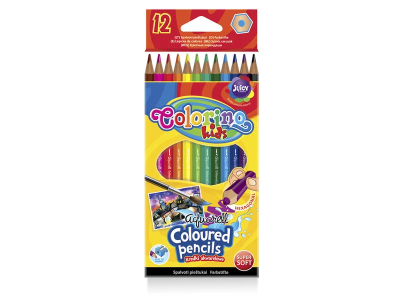 Colorino Színes aquarell ceruza 12 db + 1 ecset. Az aquarell ceruzákban puha grafitbél található, mely szilárd, nem törik könnyen. Száraz és nedves papíron is egyaránt használható. Színezés után csak egy vizes ecsettel át kell menni a rajzon és kész a festmény. A ceruzák színei nagyon szépek, öröm velük rajzolni. A ceruzák hossza 17,5 cm. 3 éves kortól ajánlott