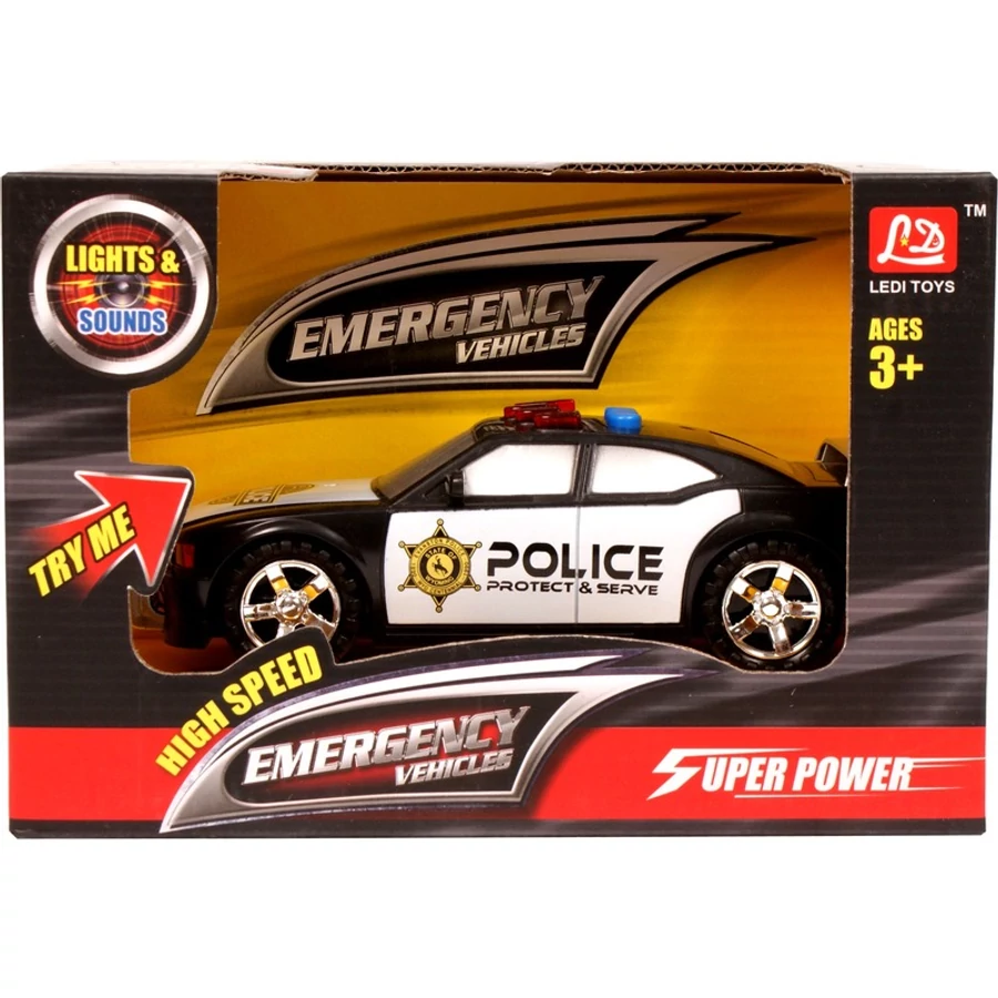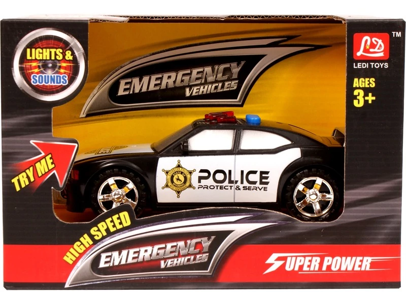 A(z) **Elemes rendőrautó** – Az Elemes rendőrautó hanggal és fénnyel egy műanyagból készült, sportos rendőrautó, fekete-fehér színben. Az autó tetején lévő gombokkal különféle hangokat tudsz kicsalni az autóból, miközben a villogói és a fényszórói villognak. 3 darab LR44 gombelemmel működik, a csomagolás az elemeket tartalmazza. Méretek: 18 x 8 x 6 cm. > 3 éves kortól