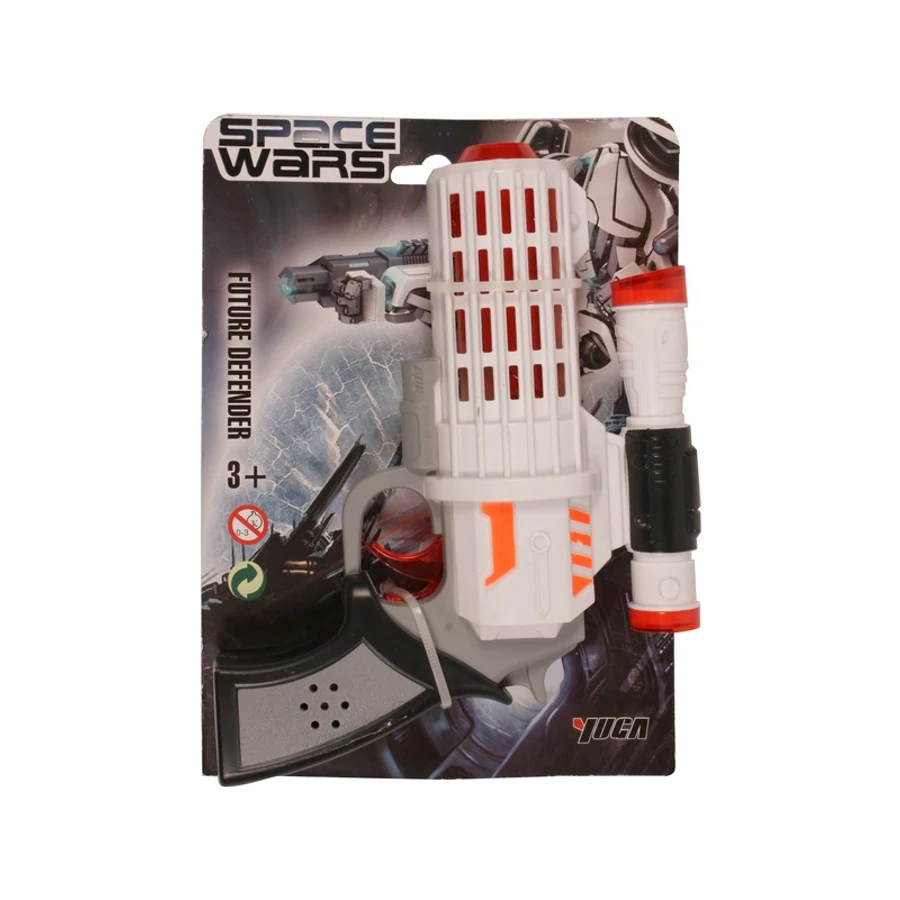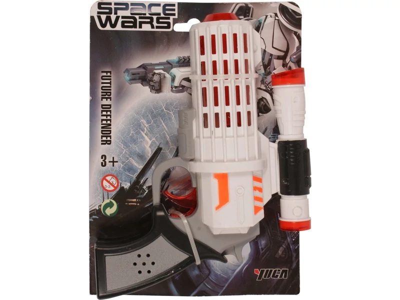 A(z) **Space Wars lézerpisztoly fénnyel és hanggal** – Ha meghúzod a pisztoly ravaszát, a csöve villog, miközben hangokat ad ki magából. A Space Wars lézerpisztoly 2 db AA ceruzaelemmel működik, a csomagolás az elemeket tartalmazza. Méretek: 19 x 5 x 15 cm. > 3 éves kortól