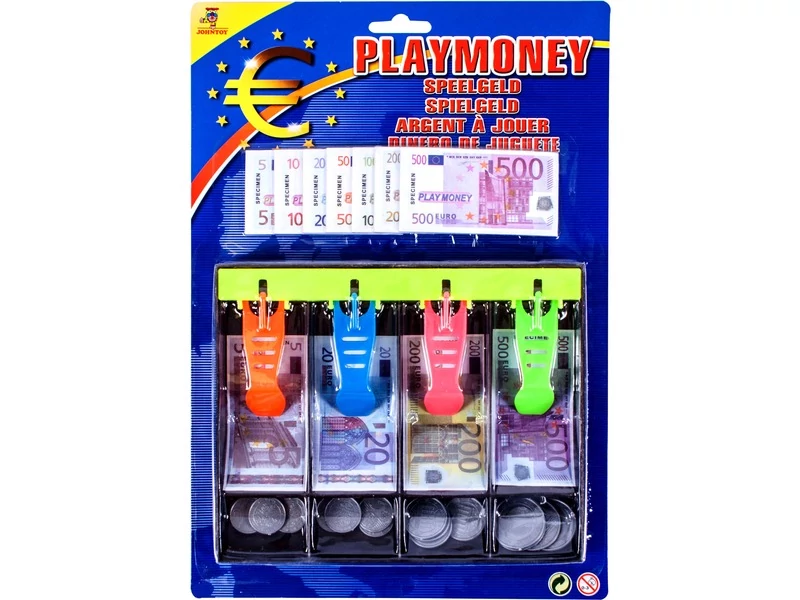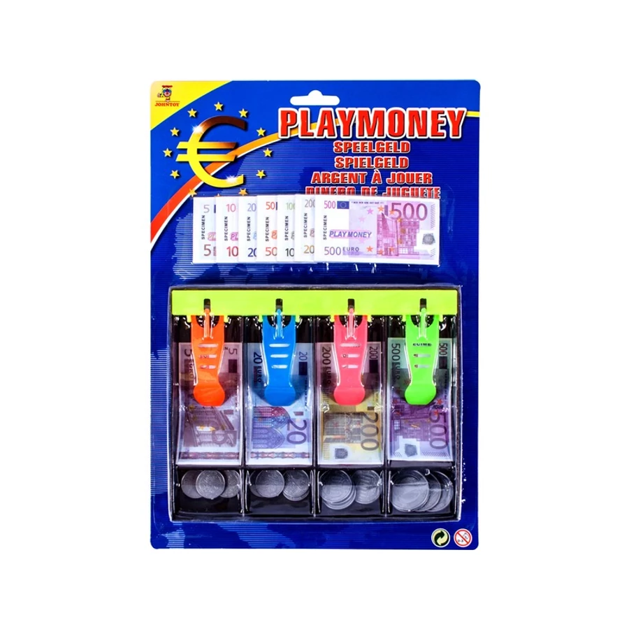 A(z) **EUR játékpént pénztáros fiókban** – Az Euro játékpénz kasszafiókkal 120 darabos készletben rengeteg papírpénzt és műanyag aprót találtok. A készlet tartalmazza az Euro címletekre hasonlító bankjegyeket, érméket, valamint egy kasszafiókot is, amiben rendszerezni lehet a játékpénzeket. Az Euro játékpénz kasszafiókkal 120 darabos készlet együtt használható a legtöbb játék pénztárgéppel is. Kasszafiók méretei: 19 x 15 x 2 cm. > 3 éves kortól