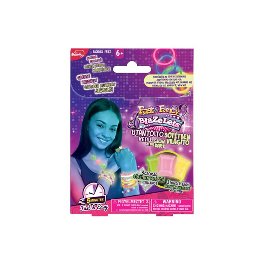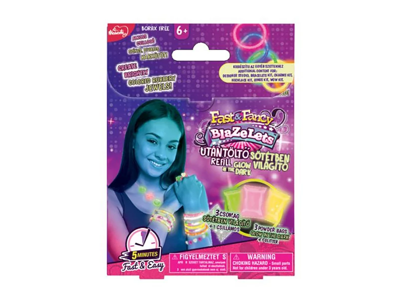 A Fast& Fancy kreatív szettjeivel varázslatos színekben pompázó karkötőket készíthetsz! Különböző színekben és formákban alkothatod meg a legdivatosabb, rugalmas ékszereidet! Minden szett tartalmazza a színes porokat, amikből a formázóba adagolva víz segítségével tudod a karkötőket elkészíteni. Újabb és újabb ötleteid támadnak, amiket karkötőbe kéne önteni, de kifogytál az alapanyagokból? A Fast& Fancy utántöltő szettjével ismét szárnyalhat a kreativitásod és már semmi sem állhatja útját, a karkötőkészítésnek. A szett tartalma: