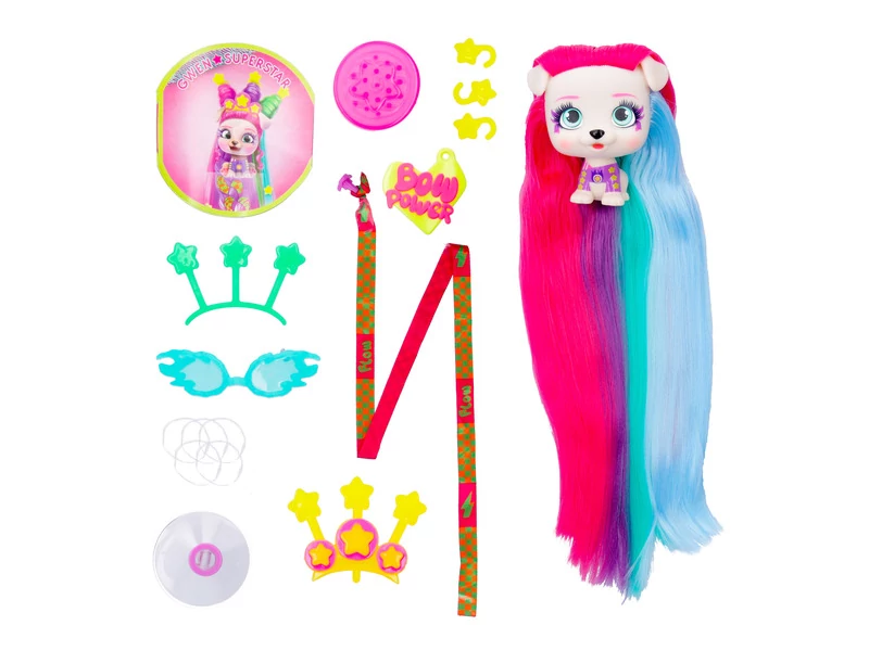 I Love Vip Pets Bow Power GewnKészülj fel egy színes és stílusos délutánra a VIP Pets Bow Power kutyusokkal, ahol minden kiskutya a divat legújabb trendjeit követi! A gyűjthető sorozatban 6 különleges kutyus várja, hogy összegyűjtse őket: Kim, Natty, Aurora, Shiara, Gwen és Juliet. Minden egyes baba több mint 9 meglepetést és 6 különböző hajba való kiegészítőt rejt, valamint egyedi szalagokkal büszkélkedik, akárcsak a népszerű YouTube sorozatban! A csomagban található fodrászszék segítségével a VIP PET haját tökéletesen megformázhatja, így a kreativitásnak csak a képzelet szabhat határt. A Bow Power Gwen kutyus extra hosszú, fésülhető hajjal és 8 db kiegészítővel érkezik a hajlakkhoz hasonlító dobozban. Díszítd fel a haját szalaggal vagy masnival, és adj hozzá egy napszemüveget az extra vagány stílusért!Jellemzők: • 6 gyűjthető VIP Pets Bow Power kutyus • Több mint 9 meglepetés és 6 hajba való kiegészítő • Egyedi szalagok minden kutyuson • Fodrászszék a hajformázáshoz • Bow Power Gwen: extra hosszú haj és 8 db kiegészítőHozd el a divat legújabb hullámát otthonodba a VIP Pets Bow Power kutyusokkal, és teremts együtt gyermekeddel egy színes és stílusos világot!Csomagolás mérete 26,5 x 10 x 8 cm.