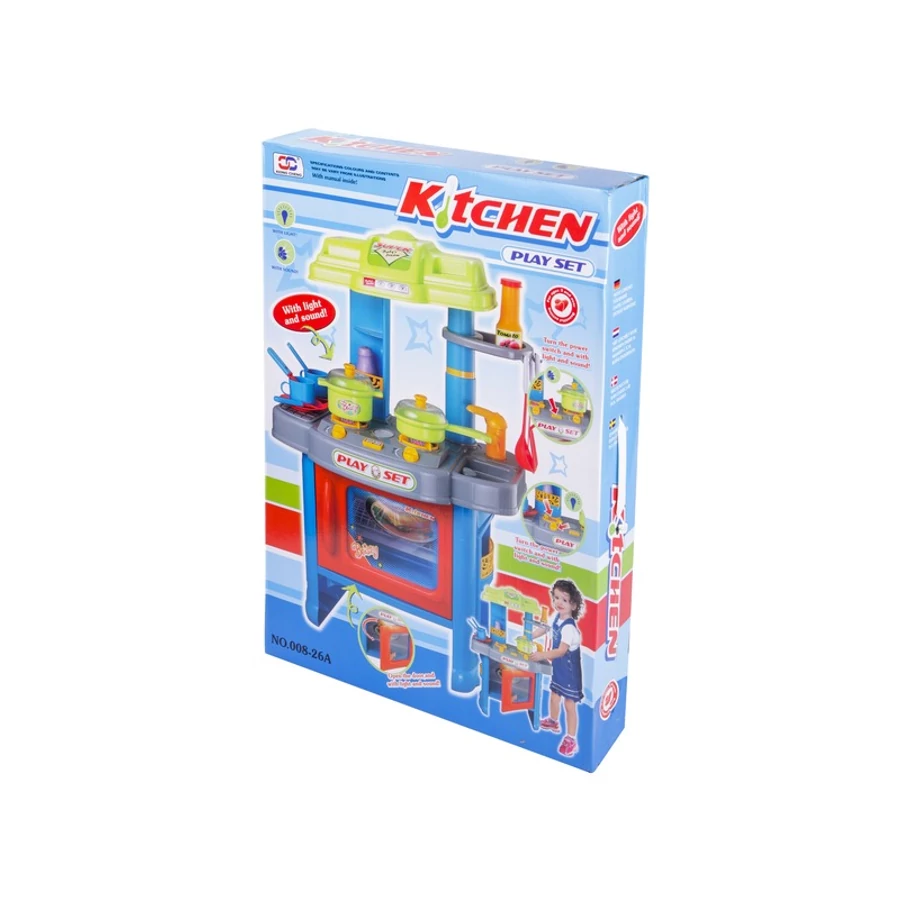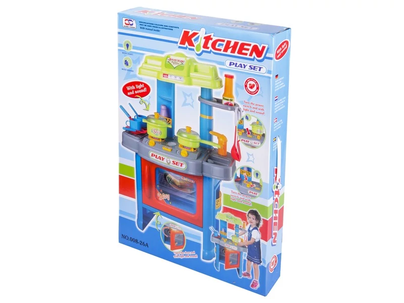 A(z) **Játékkonyha világítással** – Játékkonyha világítással - KÉK A konyha világítással is fel van szerelve. A játék 3 db AA ceruzaelemmel működik, a csomagolás az elemeket nem tartalmazza. Konyha összerakott méretei: 42 x 28 x 64 cm.