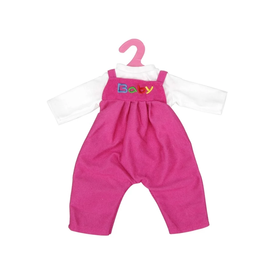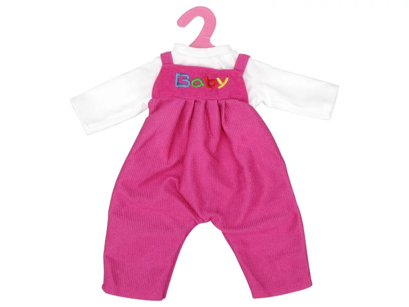 A(z) **Kantáros nadrág és póló babaruha - 46 cm** – Kantáros nadrág és póló babaruha - 46 cm A készlet egy kék színű, színes Baby felirattal díszített nadrágot, valamint egy hófehér hosszú ujjú pólót tartalmaz, amiket a játékbabára lehet ráadni. A ruhák moshatók, és bármilyen, 46 cm-es babákkal együtt használhatók. >3 éves kortól