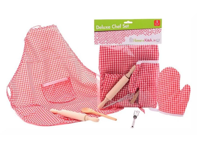 A(z) **Kicsi séf játékszett** – A Séf konyhai kiegészítő készlet egy piros-fehér kockás kötényt, fogókesztyűt, fakanalat, habverőt és egy sodrófát tartalmaz Csomagolás méretei: 24 x 32 cm. > 6 éves kortól