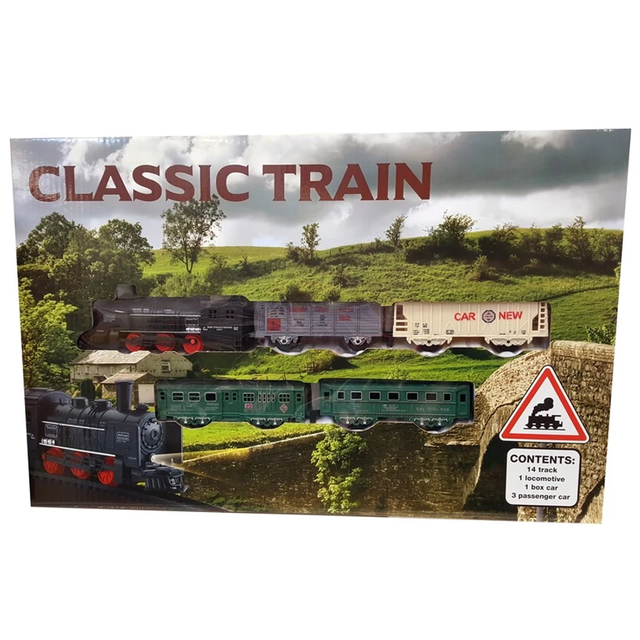 Szállíts utasokat és rakományt a gőzmozdonnyal! A Klasszikus vonat 19 darabos készlet síneket, egy gőzmozdonyt, két tehervagont, és két személyszállító vagont találsz, amikből egy komplett szerelvényt lehet összerakni. A vonatkocsikat könnyen egymáshoz lehet kapcsolni, a sínek egy mozdulattal összeilleszthetők, utána már csak be kell kapcsolnod a mozdonyt, és a sínre tenned, hogy elinduljon a szerelvény. A Klasszikus vonat 19 darabos készlet összesen 14 darab vasúti sínt foglal magában. A játék 2 darab AA ceruzaelemmel működik, a csomagolás az elemeket nem tartalmazza. Csomagolás méretei: 47 x 4 x 29 cm.