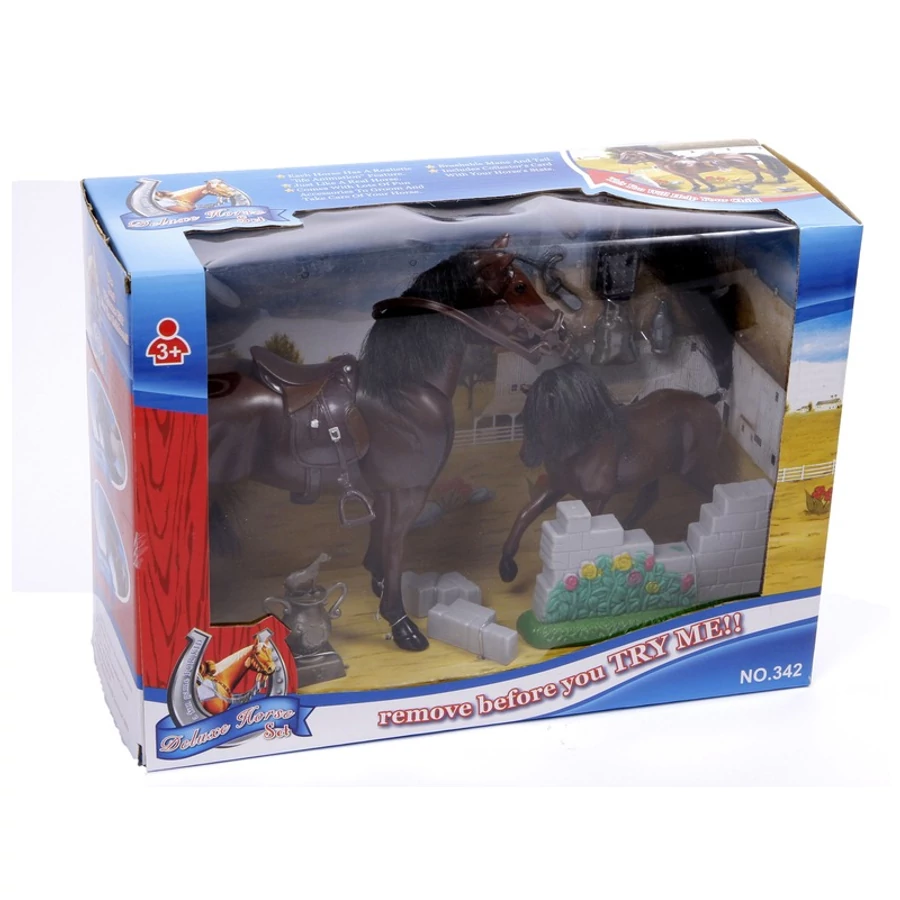 Barna paci és csikója, díjugrató készletben! A Ló és csikó készlet egy műanyagból készült felszerszámozott felnőtt lovat, egy csikót és a lovagláshoz szükséges eszközöket tartalmazza. A lovakkal gyakorolni tudod a díjugratást, az eszközökkel ki tudod fésülni a sörényüket, a táppal meg is lehet etetni a paripákat, hogy szépek és egészségesek legyenek! A Ló és csikó készlet együtt használhatók más akciófigura készletekkel is. Ló mérete: 19 cm, csikó mérete: 12 cm.
