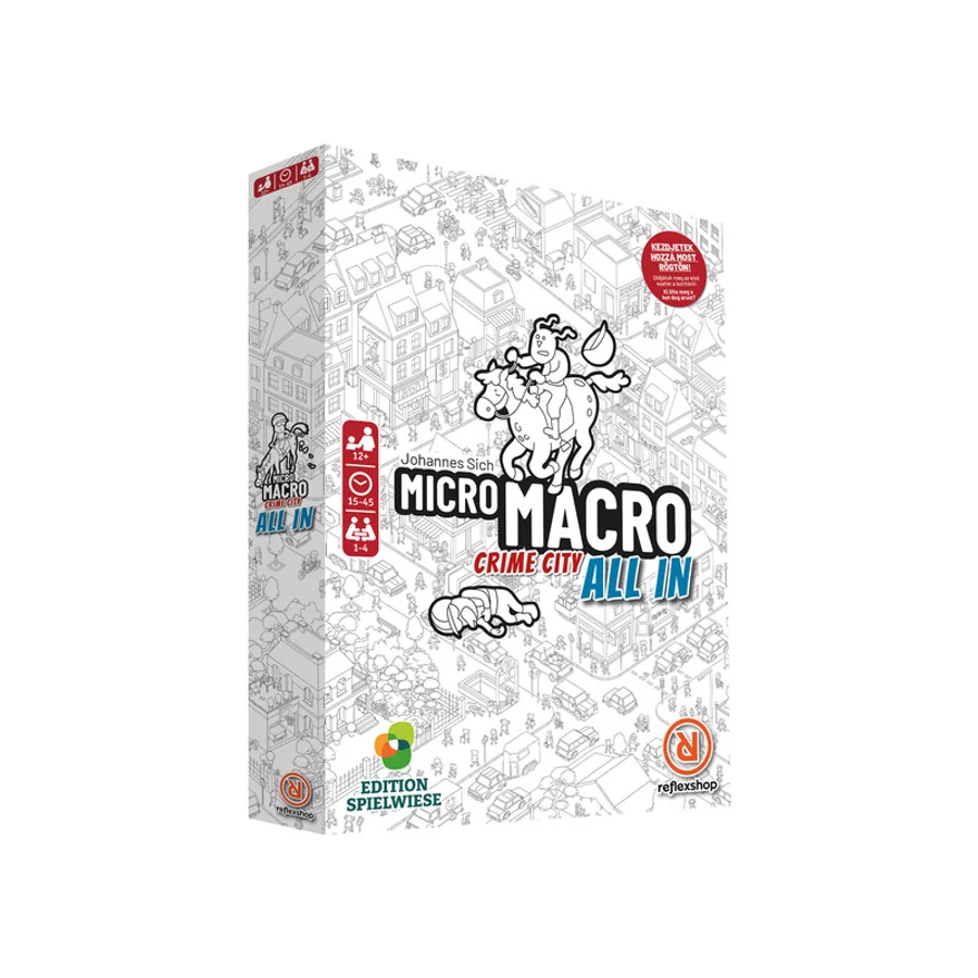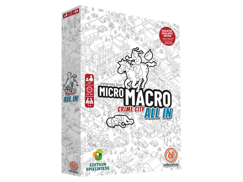 MicroMacroval: A Crime City - All In, a bűnözés sújtotta fekete-fehér metropolisz következő kerülete nyílik meg a játékosok előtt. A korábbi terveket zökkenőmentesen követő új, hatalmas várostérképen ismét 16 trükkös bűnügy várja, hogy 1-4 amatőr nyomozó megoldja őket. Ezek vadonatúj történetek, minden eddiginél kifinomultabbak és bűnözőbbek! (Az All In teljesen önállóan is játszható, nem szükséges előismeret az előző két részből.) Játékosok száma : 1 - 4 játékos részére Játékidő : 15 - 45 perc