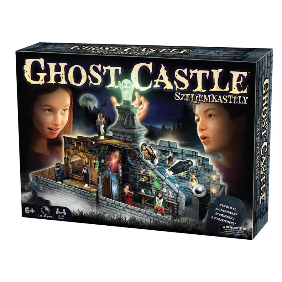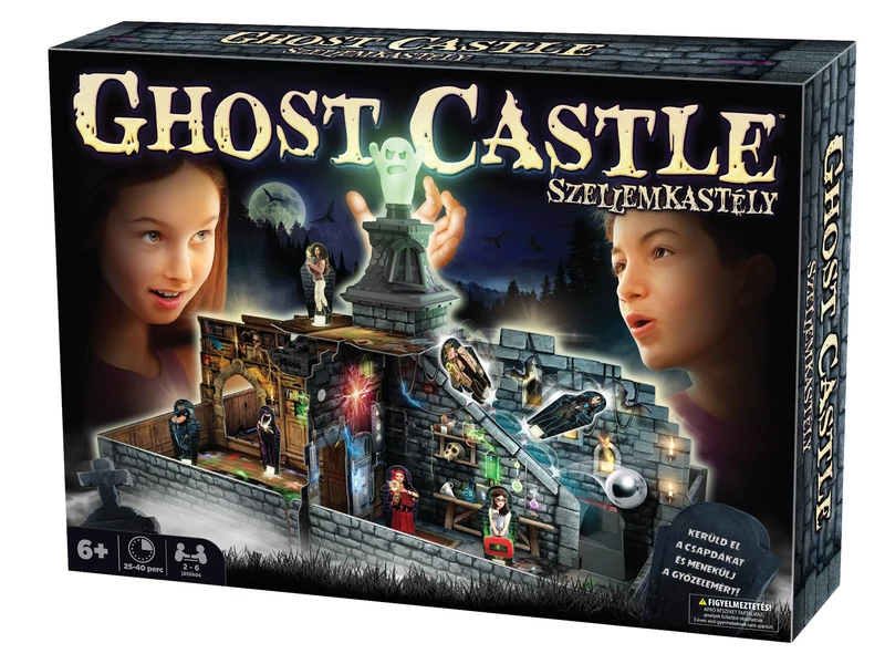 Szellemkastély társasjátékJátékosok száma: 2-6 játékos, Korosztály: 6 éves kortól ajánlott, Játékidő: 25-40 perc.Hosszú évek síri csendje után a Szellemkastélyból újra kísérteties hangok hallatszanak. Az elátkozott épület kapui újra feltárultak, bátor hősöket csábítva, hogy megküzdjenek a gonosz lidércekkel. A nagy sikerű és közkedvelt Szellemkastély társasjáték végre újra kapható! A Szellemkastély egy izgalmas és rendkívül látványos gyerek- és családi játék. A kaland során a Szellemkastély szobáit kell bejárniuk a játékosoknak, akik szakértők a paranomális tevékenységek felderítésében. Sok szóbeszéd jár a kastélyról és az ott kísértő szellemekről… és mind igaz, az utolsó szóig! Ahogy a torony irányába haladva aktiváltátok csapdák tömegét, a gonosz szellem felébredt évtizedes álmából, és most bosszúra szomjazik! Irány a lépcső, kalandorok, de ne feledkezzetek meg kelepcékről sem! A játéktér összeállítása ugyan igényelhet némi szülői segítséget, valamint pár perc előkészülést, de az asztalról kiemelkedő, 3D-s kastély, és a játék során mechanikusan működő csapdák mindenért kárpótolnak majd!