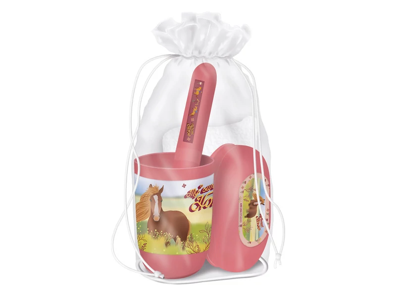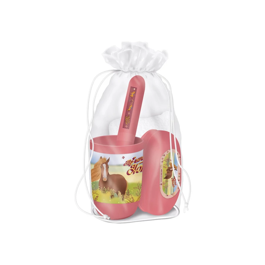A My Sweet Horse Tisztasági Csomag mindent magában foglal, amire egy gyereknek szüksége lehet a napi higiéniai rutin során. A lovas témájú készlet tartalma segít a gyerekeknek megtanulni, hogyan gondoskodjanak magukról és tartsák tisztán magukat. A praktikus tárolótáska segít a rend megtartásában, és könnyen hordozható, így a gyerekek bárhová magukkal vihetik kedvenc tisztasági készletüket.