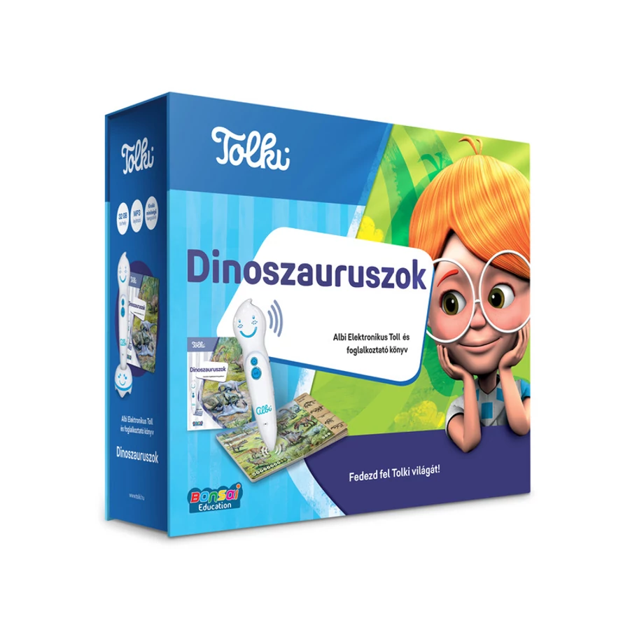 Tolki - Dinoszauruszok szett (könyv+toll) A szettben található Dinoszauruszok könyvvel fedezd fel a dinoszauruszok lenyűgöző világát! A könyv gyönyörű illusztrációi és bőséges hanganyaga segítségével megismerheted ezeket a csodálatos lényeket, amelyek évmilliókkal ezelőtt éltek a Földön. Kövesd végig a dinoszauruszok születését, aranykorát és kihalását is - amit egy hatalmas meteorit-becsapódás okozott. A könyv a legfrissebb tudományos kutatásokra épül, így minden ifjú és idősebb felfedező tanulhat belőle. A szett tartalmazza a könyvben szereplő ábrákhoz elektronikusan rögzített szövegek felolvasására szolgáló eszközt, és az annak feltöltéséhez szolgáló elektromos töltő berendezést is.