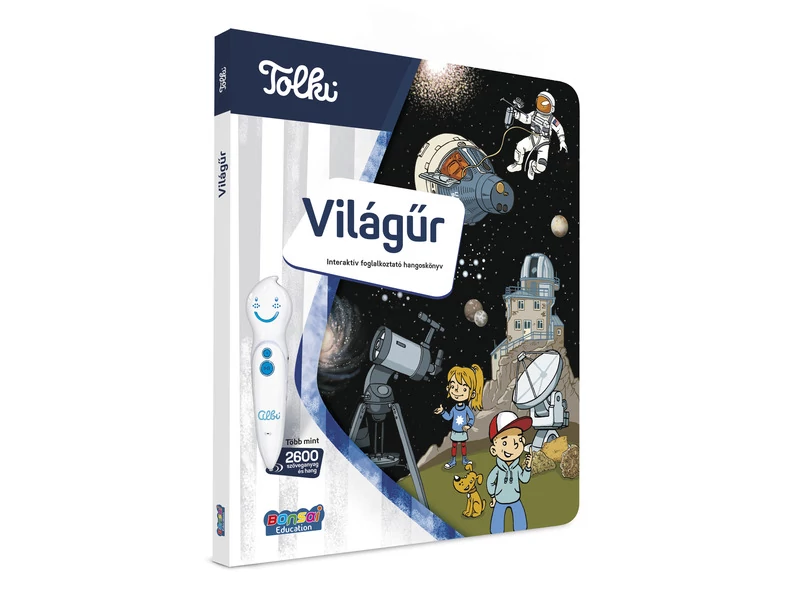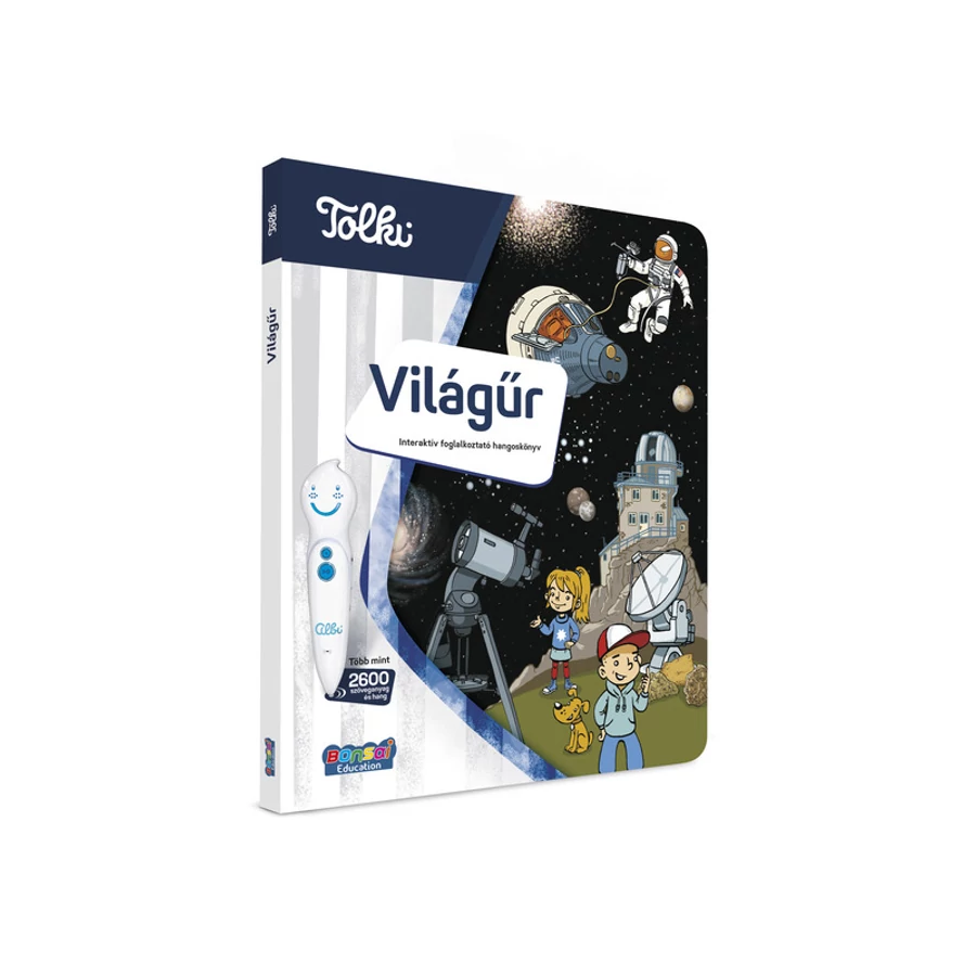 Tolki interaktív könyv -Világűr A Világűr 8 oldalpáron mutatja be a világűrt, az űrkutatás múltját, jelenét – és egy kicsit a jövőjét is. Minden oldalpárra egy-egy összefüggő téma került, például a Naprendszer, az ókori és a középkori csillagászok munkássága vagy az űrhajózás technikai fejlődése. A könyvben nagyon komoly tananyagot dolgoztunk fel, összeállításában csillagászok és tanárok is részt vettek. A sok órányi hanganyag mellé kvízkérdések százai kerültek, hogy a gyerekek önállóan is próbára tehessék tudásukat. A könyv színvonalas szövegét profi szinkronszínészek keltik életre. A Világűr narrátorai: Csuha Bori, Szabó Andor és Csuha Lajos. Az interaktív foglalkoztató hangoskönyvek kizárólag az elektronikus tollal működnek. A toll a bekapcsolása után egyetlen ikon megérintésével felismeri, hogy melyik könyv hanganyagát kell használnia. A tollat ez a könyv nem tartalmazza!