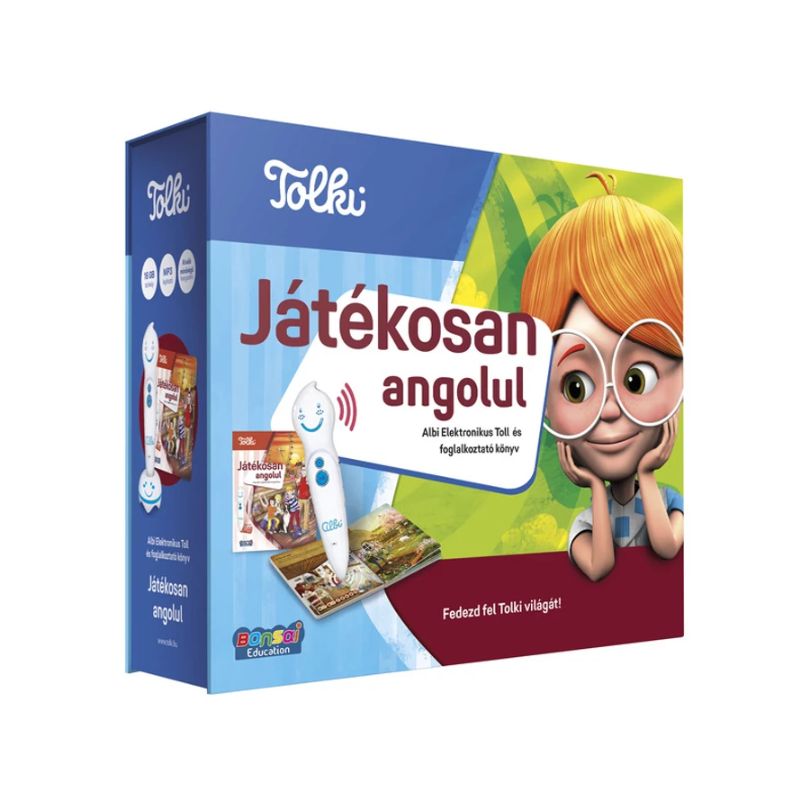 Tanulj angolul a lehető leginteraktívabb módon! A Tolki Játékosan angolul készlet (könyv +toll) kiváló választás lesz, az angolul tanulni vágyok számára. Az izgalmas könyv a nyelv legalapvetőbb témaköreit dolgozza fel. Az okostollnak köszönhetően pedig a könyvben szereplő képek életre kelnek. Illeszd rá a tolladat a könyv jobb alsó sarkában lévő ikonokra, majd keress meg valamit a képen, amit szívesen meghallgatnál. A szereplők megszólalnak, mesélnek neked és akár egy vidám éneket, mondókát is előadnak neked angolul. Természetesen a könyvben van magyar funkció is, így könnyedén lefordíthatod az elhangzottakat. A lecke végén tesztelheted tudásod a kvíz segítségével, mely 3 nehézségi fokozatban is elérhető. Éld át a tanulás adta örömöt és egyben kihívásokat, interaktív angol könyved és tollad segítségével. A Tolki - Játékosan angolul szett minden elemet tartalmaz, hogy a könyv és a toll funkciói életre kelljenek. A készletet 3 éves kortól ajánljuk.