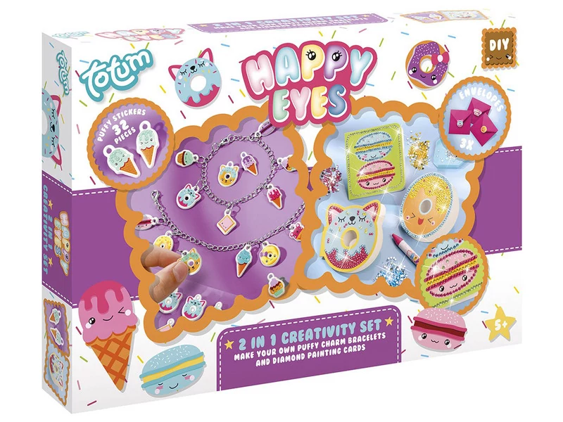 Az ismert Totum márka 2 az 1-ben kreatív készlete, amelybe 2 izgalmas kreatív szettet találsz. Az egyik szettben találsz öntőformákat, festéket, ecsetet és szalagot. Ínycsiklandó sütiket és fánkokat önthetsz a formákból, amiket saját ízlésed szerint tudsz kifesteni, majd egy szalaggal átfűzve fel tudsz akasztani bárhová. A másik kreatív készletből pedig csodálatos, egyedi karkötők készíthetők, saját kézzel színezett fagyi, süti, vagy fánkformákkal díszítve. A csomagban találsz színes ceruzákat, színezhető édességeket és a karkötőláncokat. Légy kreatív, készíts gyönyörű, színes ajándékokat, díszeket. Vedd elő a fantáziád, és játssz például sütikirálynőt az elkészült művekkel.