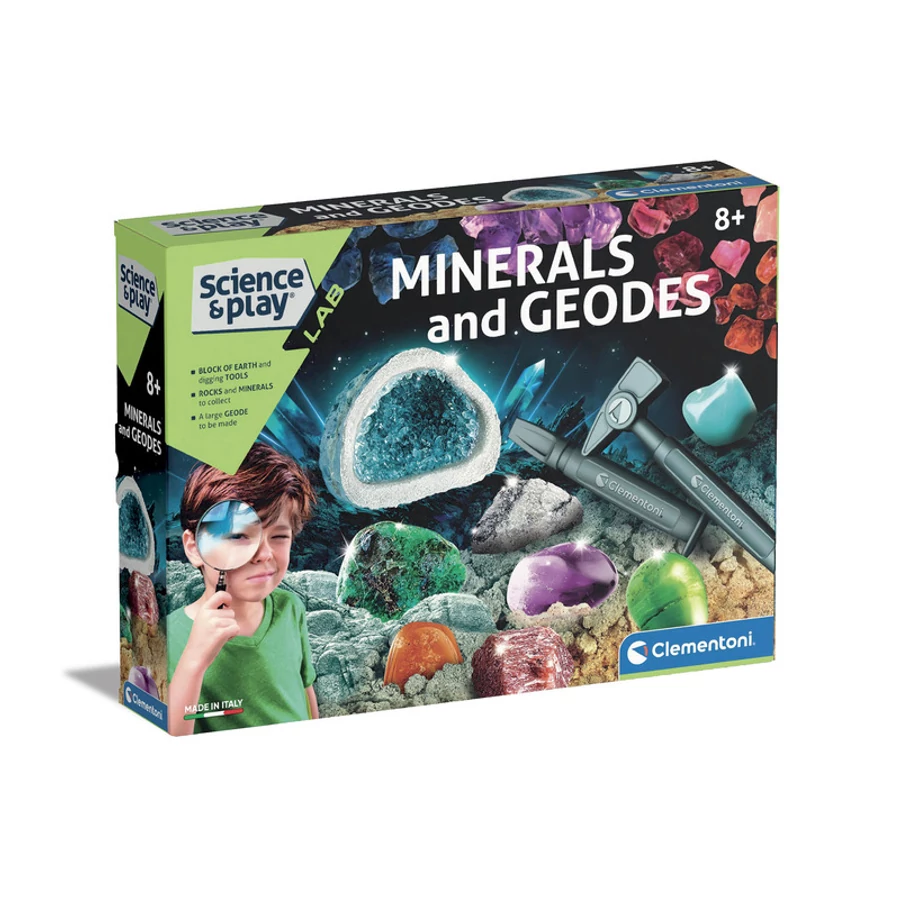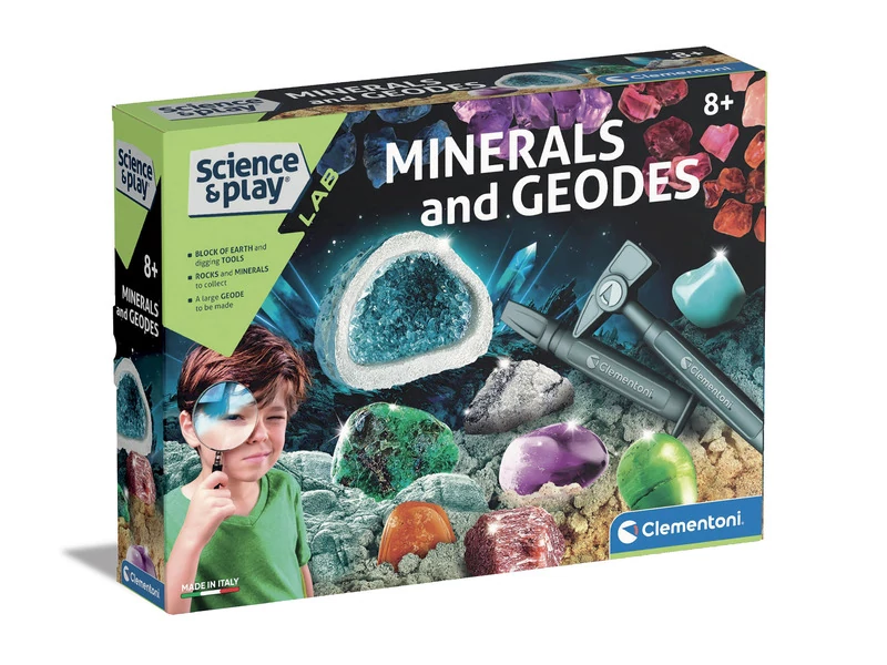 A(z) **Tudomány és Játék - Ásványok és geódák** – Tudományos készlet gyönyörű drágakövek és ásványok feltárásához. A készlet tartalmaz egy kőtömböt a drágakövek és gyűjthető kövek kiásásához. Egy formát egy lenyűgöző geoda reprodukálásához, hogy színes és csillogó kristályokkal gazdagodjon. A részletes tudományos kézikönyv tartalmazza az ásványtan és a sók kémiai reakcióinak minden titkát! Olaszországban készült
